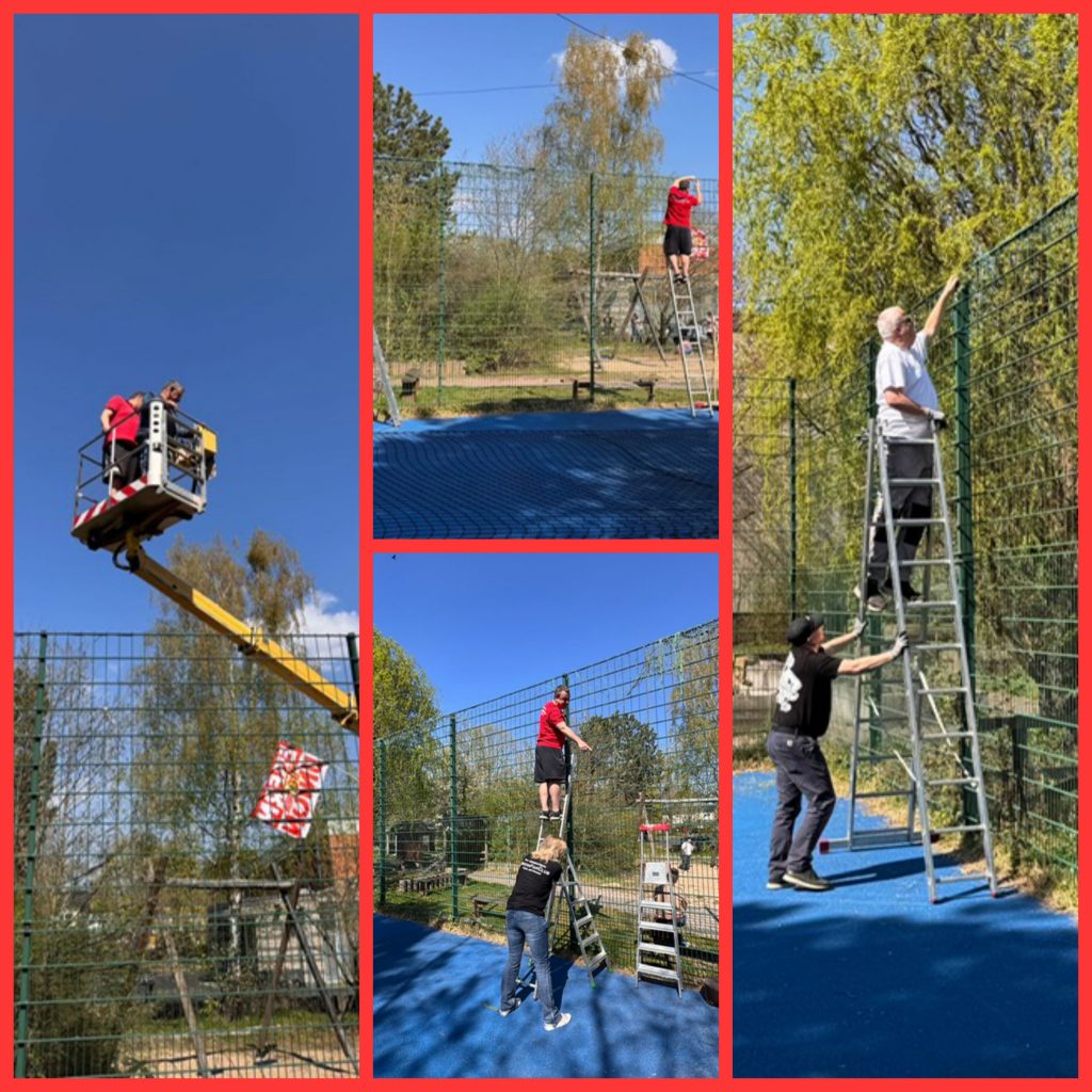 Ausgestattet mit Leitern, Hebebühne, Manpower und Kuchenverpflegung von der Bäckerei Scholz ging es hoch hinaus.